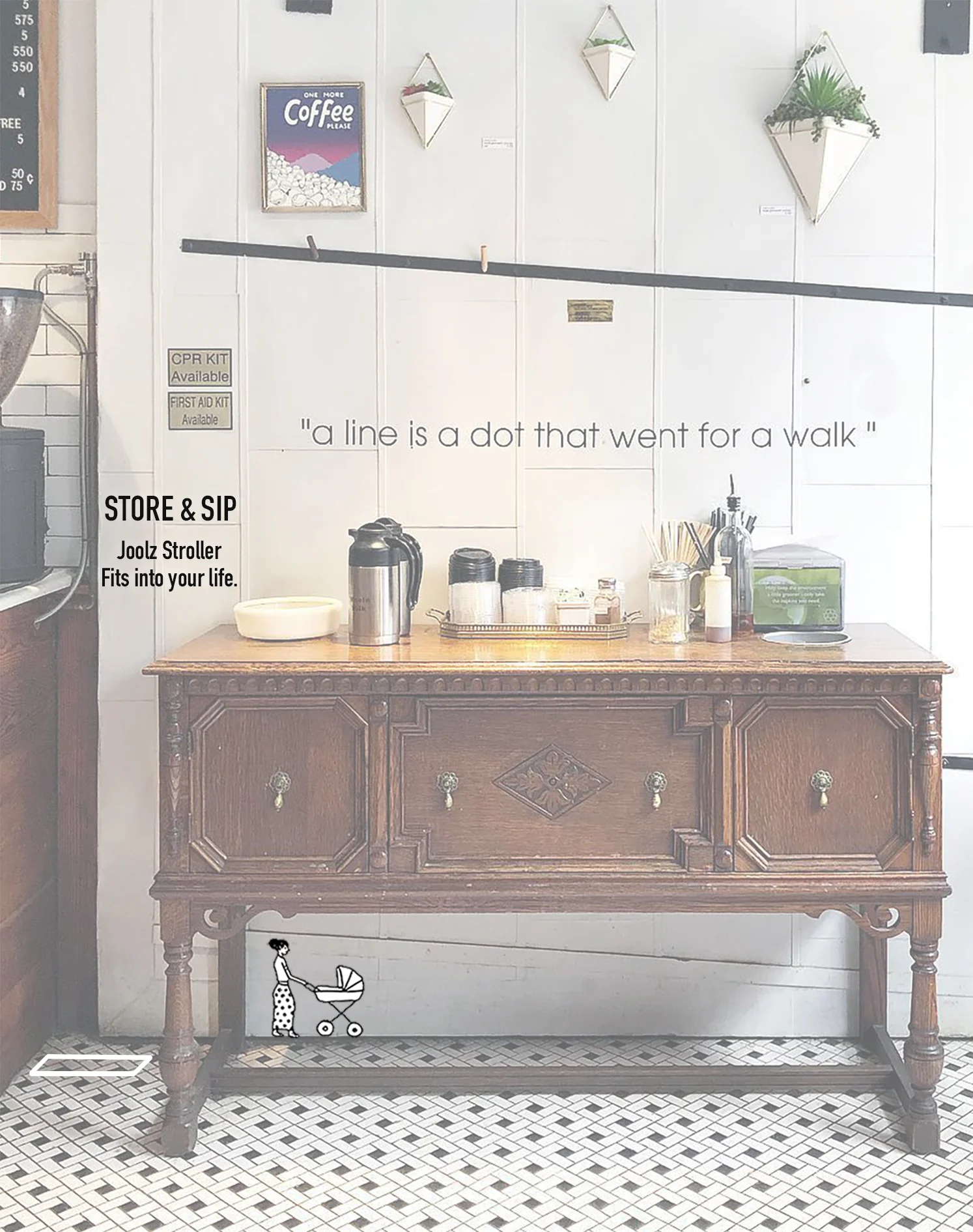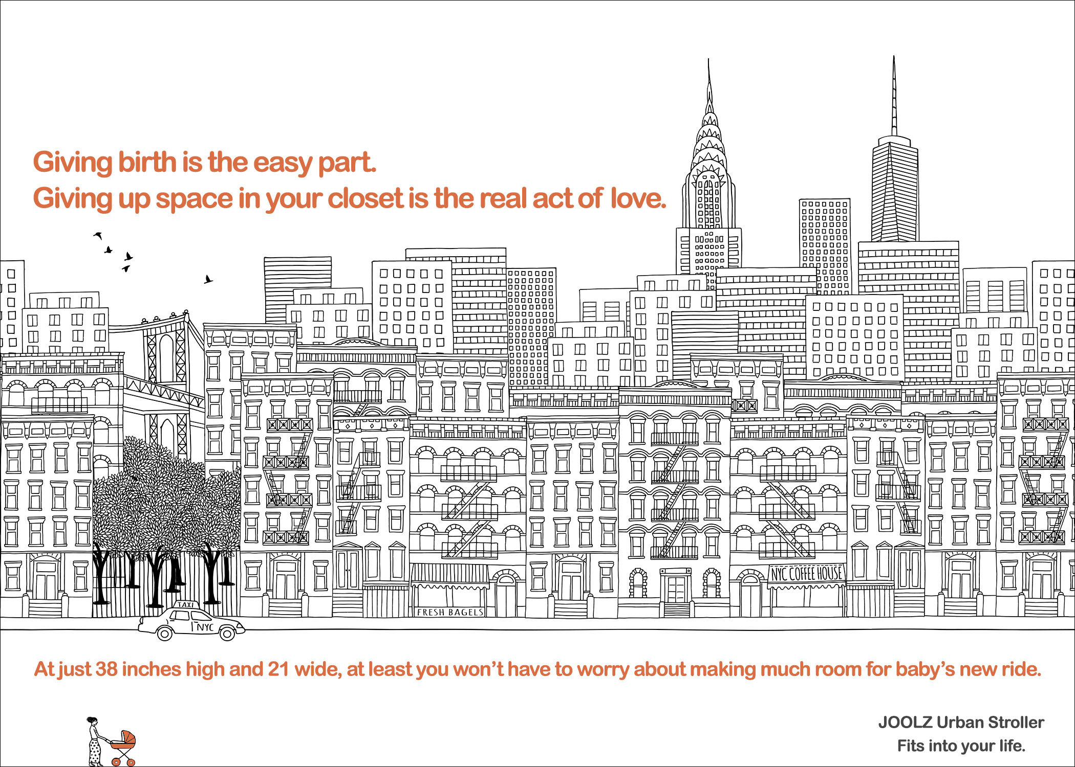 Decals in small spaces around the city illustrate the compact sizing and provide parents with a place to store their stroller.